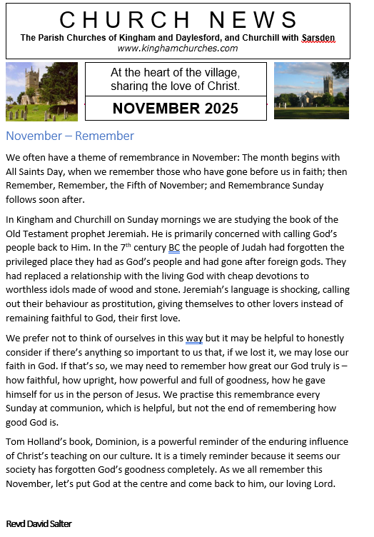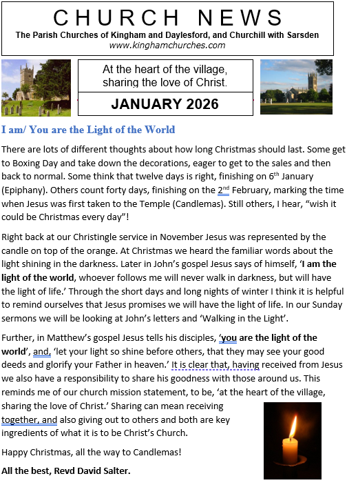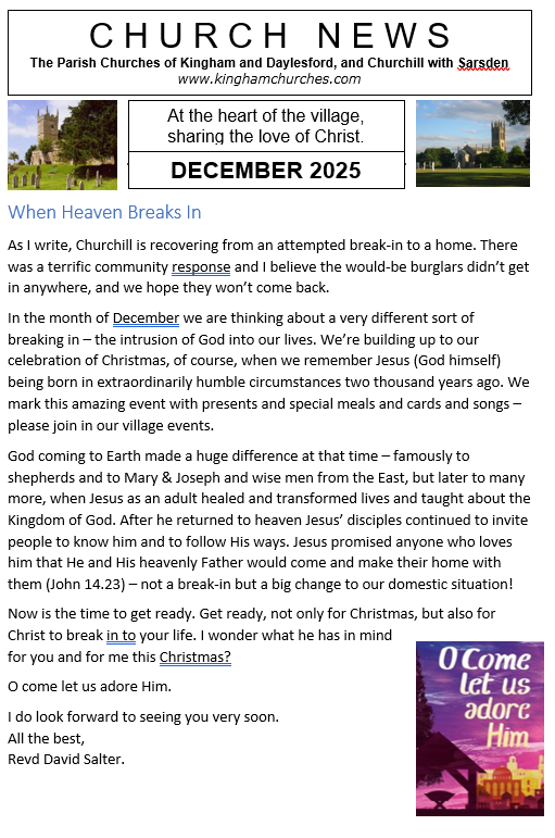 We publish Church News each month, through Roundabout for those living in Churchill and Sarsden, and in the Kingham Newsletter, which is on sale at Kingham Village Stores. You can also click the image on the right to open it in PDF format.